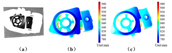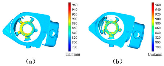 The overlapped area will result in a specific offset when the coordinates are unified. The averaging fusion algorithm converts the average value of point coordinates in a point’s field to the point’s coordinate value to guarantee the accuracy of registration. After multiple fusion calculations, the entire point cloud map of the casting can be obtained [23]. The complete point cloud map of the casting is shown in Figure 7.