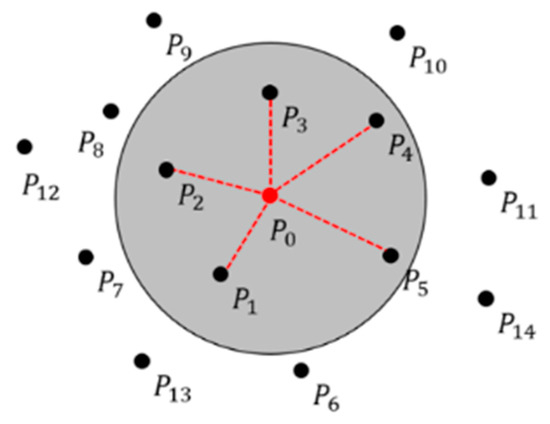 The aforementioned calculation was carried out for the surrounding points within the radius r of the circle’s center at point P0 (as shown in Figure 9). According to Equation (14), the final histogram is calculated using the simple point feature histogram (SPFH) of the nearby points. By contrasting the FPFH descriptors of the two-point clouds, the spatial coordinate system transformation between two-point clouds is calculated: