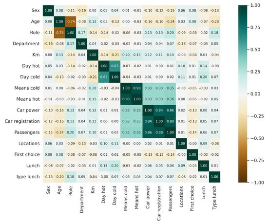 To better understand the links between the different features, we can represent their Pearson’s correlations via a heat map, as shown in Figure 1. Table 2 shows the significance levels of the various correlations (p-value), from which it is possible to extract the most important relationships between the variables and how these are statistically significant (e.g., car registration, passengers, car power, age, and role). Of course, many of these correlations are conceivable a priori, such as the strong link between variables that explain the means of transport during the two seasons (as also highlighted by the significance levels).