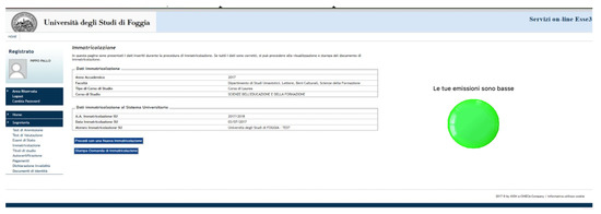 Through this calculation, the university could exploit the ESSE3 platform to sensitize those belonging to the academic community to use alternative means to cars, where possible. In particular, after setting an upper bound of emissions, we could display a sticker upon access to ESSE3 that expresses the user’s expected emissions value for the following semester: a green sticker if the emissions are below the upper bound (as shown in Figure 2), yellow if they are higher than the upper bound but within a particular deviation from this limit, and red if the expected emissions are much higher.