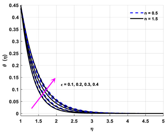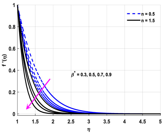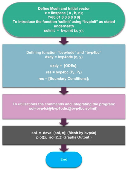 The modeled equations are highly nonlinear in nature, and their analytical solutions are not feasible. The above system of Equations (14)–(16) along with boundary conditions (17)–(19) can be handled numerically with the utilization of MATLAB built in bvp4c scheme. Finite difference scheme package is utilized by bvp4c scheme. During this procedure, the modeled PDEs are converted into first-order ODEs by considering what is suitable along with boundary conditions and are furthermore solved numerically with bvp4c package in MATLAB. The maximum residual error and step size are and .