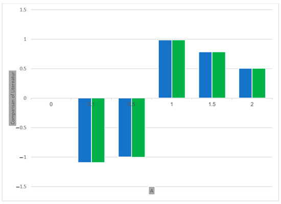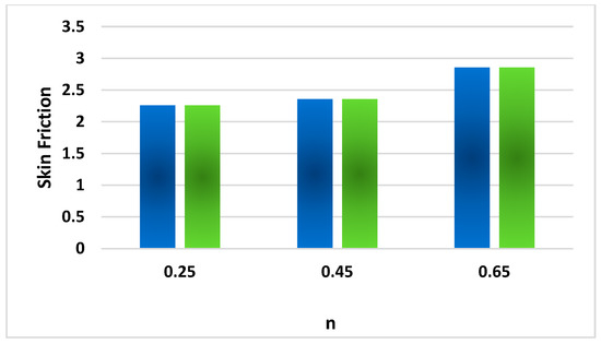 The graph in Figure 2 is brought into this section to compare the old literature [1] with the new computed values for the case of a positive variation in unsteadiness parameter A by keeping other parameters such as Re = 1 and A = 0 when n = 1 and We = 0 in the case of . This seems to be in agreement with existing literature. Blue lines represent the results obtained by Khan et al. [1], and green lines represent the results after current numerical simulation of the problem. From comparison analysis, it is quite evident that the obtained results are quite satisfactory and reliable.