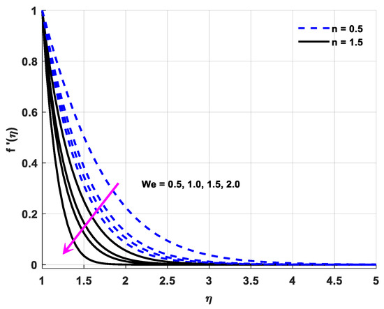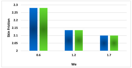 Figure 14, Figure 15, Figure 16, Figure 17, Figure 18 and Figure 19 discuss the impact of various dimensionless parameters on the surface drag coefficient. From the figures, it is crystal clear that a positive change in We, Pr diminishes the surface drag coefficient, but surface drag phenomenon escalates as a result of magnifications in Sc, A, M and . From Figure 14, it is quite evident that a positive variation in the Weissenberg number We depreciates the skin friction phenomenon. The Weissenberg number is directly related with the relaxation time. Relaxation time is the time needed by the fluid in order to regain its original shape. During this time, the fluid is allowed to relax, and its viscosity increases. Paint is an example of the Weissenberg phenomenon. The skin friction coefficient, also called drag friction, is the drag created by the friction of the fluid opposite to the object surface over which the fluid is moving. It is quite established that a positive variation in We amplifies the fluid viscosity, which is responsible for a decrement in the fluid velocity and skin friction phenomenon. Figure 15 provides the statistical analysis of the power law index against the surface drag coefficient. The viscosity of the fluid solely depends on power law index n. The fluid behavior is shear thinning in the case of n < 1, Newtonian for n = 1 and shear thickening for n > 1. It is well established that the viscosity of fluid decreases by virtue of magnification in n. Velocity is directly related with viscosity. The velocity of fluid topples the sheet velocity in the case of amplification n, which magnifies the skin friction phenomenon.