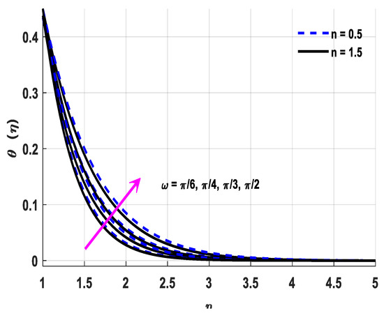 This segment of the study was conducted for the comprehensive analysis of the outcomes of the attached parameters. All physical interpretations regarding associated parameters are explored in this section. Physical quantities are represented through a statistical approach. The velocity judgment is made with help of an inclined magnetic field, and for initiation of the chemical process, the activation energy is assumed. The variable thermal conductivity responsible for the rapid transportation of heat and mass is being considered with the aid of Brownian and thermophoresis. Furthermore, infinite shear-rate viscosity depicts the key characteristics of these assumptions. All the figures are plotted in both cases through shear thinning/thickening with different values of n, and the value of n lies in . It is a case of shear thinning when , and it is a case of shear thickening when . Figure 3, Figure 4, Figure 5 and Figure 6 reveal the consequences of the attached parameters with the velocity field. Mathematical expression of “We” contains a time relaxation constant due to velocity field growth, with numerical increment in We both in the cases of thinning and thickening. The viscosity of a fluid diminishes by the virtue of a magnification in We. Shear thickening behavior is reported in the case of a positive change in We, which depreciates the fluid velocity. This fact is shown in Figure 3. Figure 4 displays the effect of inclined angle on the velocity field. Note that a positive change in . depreciates the velocity. The fluid velocity diminishes as a result of a magnification in , which lessens the fluid velocity. Figure 5 depicts the influence of inclination and magnetic effect on velocity distribution. Electrically conducting fluid in the presence of an electric and magnetic field generates a force referred to as Lorentz force. This Lorentz force is basically a resistive force. This Lorentz force acts like a barrier against fluid velocity. When an inclined magnetic field is imposed on fluid flow, Lorentz force is then automatically generated, and this Lorentz force is interrelated with speed of fluid. The velocity decreases when both the magnetic and inclination parameters are numerically augmented. The infinite shear-rate viscosity parameter causes a decrease in the velocity, and this fact is revealed by Figure 6. It is noted that shear-rate viscosity diminishes in the case of an incremental change in , which brings about a decrement in velocity. Figure 7, Figure 8, Figure 9 and Figure 10 are revealing the consequences of the parameters being attached with an energy field. The inclination angle reduces the magnitude of velocity distribution. Figure 7 is the expression of this fact. Brownian parameter increments cause an exchange of tiny particles, and due to this reason, the temperature increases. The molecules of the fluid collide more randomly, shift kinetic energy to each other and enhance the thermal conductivity phenomenon much better in the presence of the Brownian diffusion phenomenon. That is why a positive variation in Nb improves the thermal conductivity and amplifies the temperature field. The Brownian parameter and its connection with temperature are shown in Figure 8. Figure 9 is included for showing the impact of the magnetic parameter effects on the distribution of temperature. The magnetic field causes Lorentz force, and this causes lower temperature. Viscosity is inversely related to the temperature. A positive variation in M depreciates the viscosity phenomenon, which reduces the velocity and amplifies the temperature, on the other hand. As a result, the temperature field escalates. Thermal conductivity is in direct relation with temperature, and its consequences on the energy field are exhibited in Figure 10. The ability of any material to conduct heat is called thermal conductivity. A material’s ability to transfer heat increases with the consideration of nanoparticles in the base fluid. Molecules collide more frequently due to a change in thermal conductivity, which increases the kinetic energy of the fluid’s molecules and the temperature field. Figure 11, Figure 12 and Figure 13 reveal the consequences of the attached parameters with the mass transportation field. Mass diffusivity is related to the Schmidt number, and due to this fact, the mass transportation becomes lower. The Schmidt number’s role is the same for mass transportation as the Prandtl number is for heat transportation. The Schmidt number is the ratio of momentum diffusivity to mass diffusivity. A positive variation in Sc magnifies the concentration of nanofluid, which provides a resistance-free motion to the mass transport and depreciates the concentration field. The Brownian motion parameter also results in a reduction of mass transportation. The temperature of the fluid is magnified by virtue of an amplification in Nb, which otherwise diminishes the concentration of fluid molecules and depreciates the concentration field. Note that a positive change in A encourages the fluid viscosity phenomenon, which amplifies the temperature and diminishes the concentration field phenomenon. Similarly, the unsteadiness parameter gives the same result as Sc and Nb.