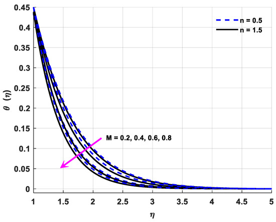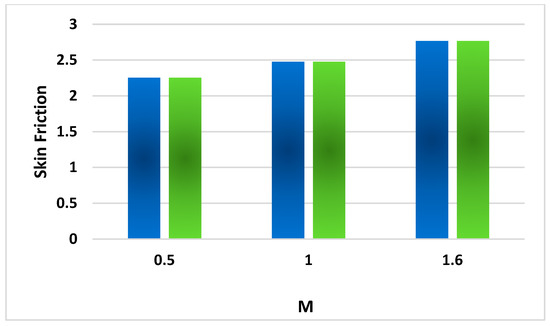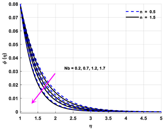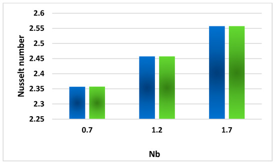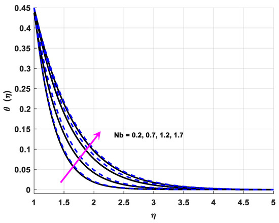 Figure 16 displays the impact of the Prandtl number Pr on the drag coefficient. The Prandtl number is the dimensionless quantity expressing the ratio of momentum diffusivity to the thermal diffusivity. Momentum diffusivity is the dynamic viscosity to fluid density ratio, and thermal diffusivity expresses the ratio of thermal conduction to density and specific heat. Viscosity is inversely related to temperature. A decrement in temperature depreciates thermal diffusivity and moreover strengthens the fluid viscosity and momentum diffusion phenomenon. That is why a positive variation in Pr magnifies the fluid velocity and surface drag phenomenon. The effect of unsteady parameter A on the surface drag coefficient is highlighted in Figure 17. Velocity is inversely related to the surface drag phenomenon. Note that the fluid velocity decreases as a result of a magnification in A. The fluid is almost impossible to move due to an increment in A, which depreciates the fluid velocity and amplifies the surface drag phenomenon because the velocity of the fluid flow is inversely linked with the drag phenomenon. Figure 18 is designed to explore the effect of magnetic parameter M on the surface drag coefficient. Electrical conducting fluid when passing through electric and magnetic fields produces a force called Lorentz force. Lorentz force is basically a resistive force. Lorentz force acts like a barrier in the case of fluid flow across the medium. This Lorentz force slows the fluid motion. This is called the MHD phenomenon, which has distinguished applications such as in MHD generators, metal batteries, cooling of nuclear reactors, etc. It is observed that the flow velocity diminishes in the presence of Lorentz forces, which brings about a reduction in fluid velocity and moreover amplifies the drag friction phenomenon. Figure 19 is designed to study the effect of Nb on the heat transfer Nusselt number. The parameter Nb indicates the Brownian motion of the molecules. Molecules collide more randomly as a result of an amplification in Nb. The molecules shift kinetic energy to each other and amplify the temperature inside the fluid. It is well established that the thermal conduction of the fluid also increases due to a positive change in Nb, which escalates the fluid temperature and heat transfer Nusselt number.