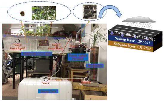 The PBT-GR system mainly comprises a porous asphalt pavement, a bioretention system, a storage tank and a green roof for the hydroponic growth of vegetables. The stormwater produced by a simulated rainfall system firstly enters the porous asphalt pavement, following which the water enters the bioretention system through gravity, then flows into the storage tank and is finally transmitted to the hydroponic green roof through a peristaltic pump. The porous asphalt pavement used was an I-type semi-permeable pavement with a size of 300 mm (length) × 300 mm (width) × 200 mm (height) and a void ratio of 24.3%. All structural layers were designed in accordance with relevant domestic standards, such as the CJJ/T 190-2012 standard of porous asphalt pavement [20]. The bioretention system comprised a cylinder composed of organic glass with a catchment area of 1:10, a diameter of 60 mm and a height of 600 mm. The bioretention system incorporated a submerged layer (100 mm), filter medium layer (500 mm) and gravel drainage layer (100 mm). The filter medium layer was composed of a uniform mixture of 80% natural sand and 20% soil mass, whereas the drainage layer was composed of gravel with particle size of 5 mm–10 mm. The dimensions of the hydroponic green roof were 1200 mm (length) × 300 mm (width) × 400 mm (height) and it was composed of a light substrate layer of 200 mm thickness containing water spinach. Figure 1 is a photograph showing the test device.