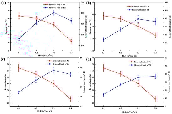 The influence of hydraulic loading on pollutant removal (mean ± standard deviation). (a–d) are TN, TP, Zn and Pb respectively.