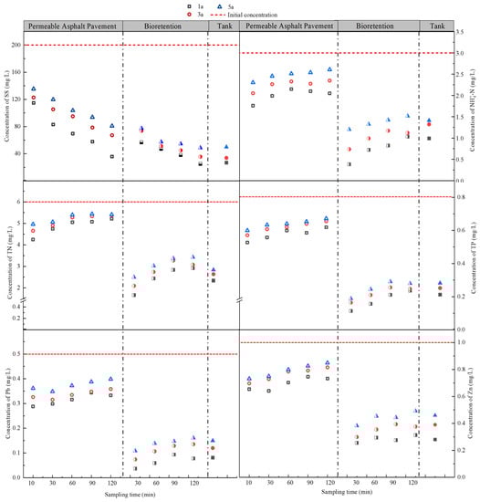 Figure 3 shows the effectiveness of the PB system in removing pollutants from stormwater runoff under three rainfall intensities. There was a gradual increase in the concentrations of TN, TP, Pb and Zn with an increasing duration of rainfall, but not for SS. The results showed that the SS removal rate within the PB system decreased with increasing rainfall intensity. The greatest SS removal rate was achieved at a rainfall intensity of 1a. The concentrations of SS in the effluents of the porous asphalt pavement and bioretention systems were 35.8 mg/L and 21.1 mg/L, respectively. However, an increase in rainfall intensity to 5a resulted in the SS removal rate from the effluent of porous asphalt pavement and bioretention tank systems decreasing by 22.5% and 16.1%, respectively. This result was consistent with research by Li Haiyan [25] and Wang Dongqi [26]. The removal of SS by the porous asphalt pavement and bioretention pond mainly relies on interspace interception and surface adsorption. Due to the high rainfall intensity and obvious scour effect under heavy rainfall, rainwater runoff will rapidly flush SS through the porous asphalt pavement and bioretention ponds. The concentration of NH4+-N increased with increasing rainfall duration, thereby showing an opposite trend to that of SS. The NH4+-N removal rate by the PB system decreased by 10–13% during the later period compared with that in the earlier stage of rainfall. The NH4+-N removal rate gradually decreased with increasing rainfall intensity. The NH4+-N concentration of the effluent of the PB system was 1.18 mg/L when the rainfall intensity was 1a, falling within the class IV standard for surface water in China. An increase in the rainfall intensity to 5a resulted in the NH4+-N removal rate of the PB system decreasing by 15.8%, with the effluent NH4+-N concentration reaching 1.68 mg/L. The change in TN was similar to that of NH4+-N, although the NH4+-N removal rate in the PB system reached >30% under a rainfall intensity of 1a, the TN removal rate reached a maximum of only 15.3%. This result showed that there was a change in nitrogen forms in the PB system without overall removal, while the bioretention unit greatly improved the TN removal rate. The inclusion of a bioretention unit can increase the TN removal rate by 27.1–32.9% compared to use of a single porous asphalt pavement unit, mainly due to its strong water retention and adsorption capacity [27]. In addition, the presence of an anoxic region in the lower part of the bioretention unit may facilitate denitrification to remove nitrate nitrogen, thereby improving the TN removal rate. These results are consistent with those of Gong et al. [9]. Some differences were evident compared to those by Jiang Wei et al. [28] mainly due to the high voidage of the porous asphalt pavement in the present study and the low pollutant concentrations of artificial rainwater [27]. The TN concentrations of the effluent in the PB system under a rainfall intensity of 1a–5a were 3.2 mg/L–3.8 mg/L, thereby exceeding the class V surface water limit level in China. The direct discharge of effluent with this TN concentration range would have serious effects on the ecological environment. Removal of nitrogen from the effluent could provide fertilizer resources needed for agriculture.