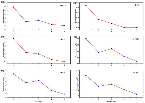 Removal of pollutants across the PBT-GR system. The sampling points 1 to 5 represent the porous asphalt pavement, the bioretention outlet, the storage tank and two sampling points within the hydroponics green roof, respectively. (a) suspended solids (SS); (b) ammonium nitrogen; (c) total nitrogen (TN); (d) total phosphorus (TP); (e) Pb; (f) Zn.
