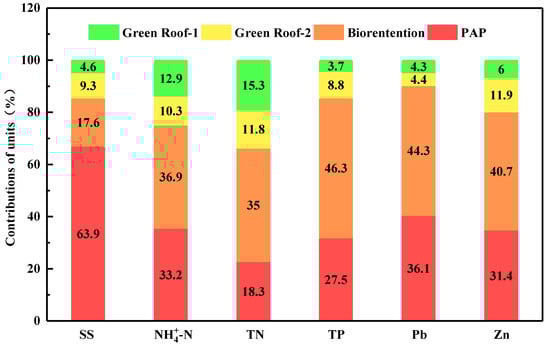 Figure 4 shows the pollutant concentration of each unit of the combined PBT system. The removal of pollutants by the PBT-GR system mainly relied on the combined action of the porous pavement, bioretention system and the hydroponics green roof. The removal rates of different pollutants increased as water moved through the different units. Water quality achieved through secondary purification by the bioretention system improved significantly compared to that achieved by primary purification through the porous pavement. Compared to that achieved by the porous pavement, the bioretention system increased SS, N, P, Pb and Zn removal rates from 63.9 ± 2.1%, 18.8 ± 0.5%, 27.8 ± 1.2%, 36.8 ± 3.4%, 30.4 ± 2.7% to 90.5 ± 6.7%, 53.3 ± 4.3%, 73.8 ± 4.7%, 80.4 ± 7.1% and 72.1 ± 6.9%, respectively. Figure 5 shows the contributions of different components of the PBT-GR system to the overall removal of different pollutants. The removal rates of N, P and heavy metals achieved by the bioretention unit (>35%) were higher than those achieved by the porous pavement (<36.1%) and green roof (<27.1%). The green roof achieved lower removal rates compared to the bioretention unit since rainwater entering the green roof had relatively stable pollution loads. The aerobic and anaerobic environment of the green roof wetland provided an environment suitable for sustaining the growth of plants and microorganisms [30], and therefore the green roof was effective at removal of nitrogen pollutants. The removal rate of SS by the porous pavement (>63.9%) was significantly higher than those of the bioretention system (17.6%) and green roof (13.9%), respectively. This was due to the presence of unique internally connected and semi-connected cavities of the porous asphalt pavement, which formed a dense network structure. The majority of particulate pollutants were intercepted by the upper structure of the porous pavement, with only a small portion of sediment with a small sediment particle size passing through the porous asphalt pavement into the bioretention system and reservoir. This result is consistent with that obtained by Li Haiyan [25] and Cui Xinzhuang [30]. Within the entire PB system, the role of the reservoir was mainly to regulate water storage, while the removal of SS through precipitation in the reservoir was limited. This was because rainwater had a short residence time in the reservoir and because the majority of particulate matter had been intercepted by the porous asphalt pavement.