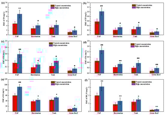 Event mean concentrations (EMCs) of pollutants in the PBT-GR system under two types of concentration for synthetic stormwater runoff used in the study (n = 6). * representing p < 0.1 and ** representing p < 0.05. (a–f) represent TN, TP, Pb, Zn, SS, NH+4-N respectively.