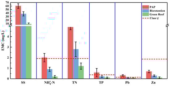 The PBT-GR system showed a higher TN removal efficiency under high TN concentrations (extreme event) compared to that under normal TN concentrations, with the bioretention and green roof systems performing particularly well at 59.4% and 83.1%, respectively. Lucke et al. [32] and Gong et al. [9] determined that the removal ratios of TN in a bioretention and a green roof system under high inflow concentrations were 30.1% and 72.4%, respectively, which were higher than that at low pollutant inflow concentrations. The PBT-GR system was able to simultaneously remove nutrients and heavy metals from runoff. It was inferred that the typical concentrations of SS, TN, TP, Pb and Zn in the porous asphalt pavement and bioretention system under a rainfall recurrence interval of 2a were 9.2 mg/L, 1.2 mg/L, 0.11 mg/L, 0.08 mg/L and 0.13 mg/L, respectively, whereas hydraulic loading in the green roof was 0.3 m3·(m2·d)−1. Under the high pollutant concentration (extreme event) experiment, the concentrations of SS, TN, TP, Pb and Zn were found to be 13.6 mg/L, 1.94 mg/L, 0.15 mg/L, 0.14 mg/L and 0.29 mg/L, respectively. A noteworthy outcome of the present study was the observation that the PBT-GR system was enabled to simultaneously remove nutrients and heavy metals from runoff, even under extreme pollutant concentrations.