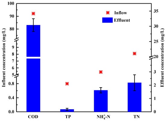 The PBT-GR system was shown to effectively treat road rainwater runoff, with the quality of the effluent to be similar or improved compared to that of membrane bioreactors, sequencing batch reactors and LID facilities [42,43,44]. After disinfection, the effluent would be of sufficient quality for application in the flushing of toilets, irrigating landscapes and flushing roads. In addition, the installation of ecological treatment facilities such as the PBT-GR system on roofs can help alleviate problems associated with excessive land use. However, significant differences in rainfall and water quality exist for different regions and seasons. The rainfall interval periods over different regions vary greatly, particularly for some arid areas, which can easily result in insufficient collection of rainwater or excessive supply of rainwater to a hydroponic green roof, and therefore rainwater runoff storage and utilization efficiency is dependent on regional climate. The present study attempted to explore the integration of urban domestic grey water treatment technology with a green roof hydroponic wetland based on the published domestic and international engineering application studies to meet irrigation water demand during a drought period. The feasibility of this approach was preliminarily studied with the assumptions of the roof area being 100 m2 and the per-capita daily water usage being 50 L and by reference to the configuration concentration by Song et al. [15]. Figure 8 shows the results of this analysis. Under a hydraulic retention time (HRT) of 3 days, the effluent concentrations of COD (Chemical Oxygen Demand), NH4+-N, TN and TP were 35.3 ± 4.8 mg/L, 0.4 ± 0.1 mg/L, 1.3 ± 0.2 mg/L and 0.14 ± 0.04 mg/L, respectively, which met the class V surface water standards in China. This result further supports the feasibility of this approach for water quality treatment. Moreover, placing ecological treatment facilities on roofs can help alleviate the problems associated with excessive land use and urban heat island effect. These systems have the advantages of low operating costs, conservation of building energy and reduction in emissions.