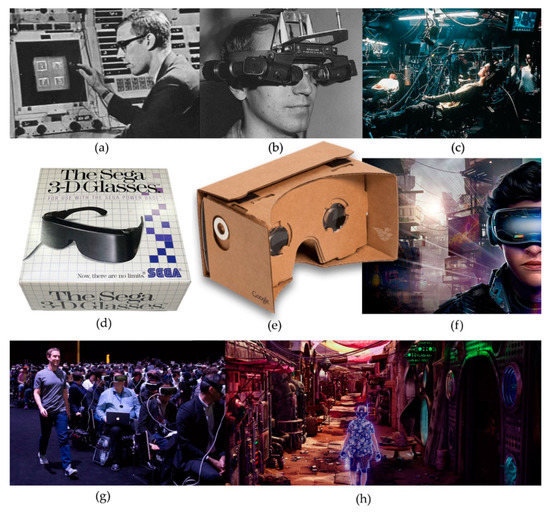 (a) On the left: Timothy Johnson working with Sketchpad III and (b) Ivan Sutherland’s head-mounted 3D display (1968). Both devices were precursors of current technology influencing cinema and science fiction: (c) The Matrix (1999), directed by the Wachowski sisters; (d) 3D Glasses or SegaScope 3-D from the Master System, designed by Mark Cerny (1987); (e) Google Cardboard as a low-cost VR system (2014); (f) Ready Player One (2018), directed by Steven Spielberg; and finally; (g) Mark Zuckerberg at an Oculus demo; (h) Valérian et la Cité des mille planètes (2017), directed by Luc Besson, proposing an alternative to tourism through virtual reality.