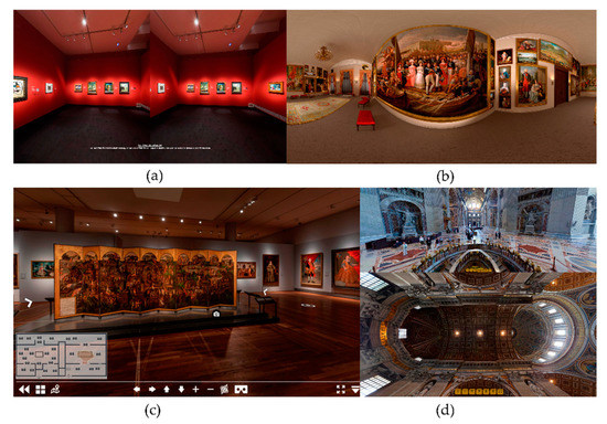 (a) On the left is WebVR with headset tracking of the collection “Dalí and surrealism” from the International Museum Thyssen-Bornemisza; (b,c) virtual visit: “Mythological Passions” of the Prado Museum; (d) virtual tour of Saint Peter’s Basilica in the Vatican. Details of the Sistine Chapel.