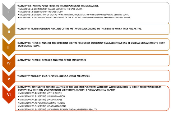 The research work scheme is divided into the following 6 activities (Figure 5), which start from a digital twin generated by a photogrammetric [43] survey with a drone and work their way up to the different configurations of a particular metaverse: