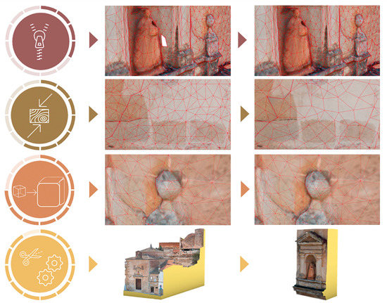- De Marco, R.; Parrinello, S. Management of Mesh Features in 3d Reality-Based Polygonal Models to Support Non-Invasive Structural Diagnosis and Emergency Analysis in the Context of Earthquake Heritage in Italy. Int. Arch. Photogramm. Remote Sens. Spat. Inf. Sci. 2021, 46, 173–180. [Google Scholar] [CrossRef]