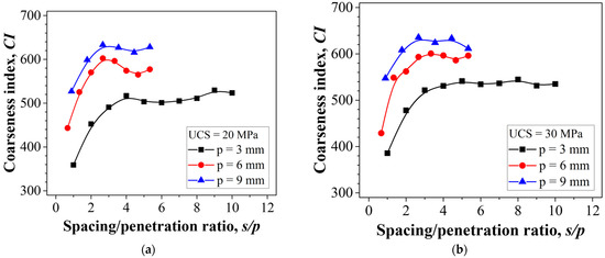 Figure 9 shows the relationship between CI and the s/p. Even for the same s/p value, as the penetration depth increased, the CI increased. When the s/p was relatively small (s/p < 3), CI increased as the s/p increased. The CI reached its maximum value near a specific s/p, regardless of the penetration depth. After reaching the maximum value, the CI value did not change significantly, even when the s/p increased. Taking a closer look at the cutting of rock of UCS 30 MPa (Figure 9b), CI reached its maximum near an s/p of 3, and the values were approximately 520, 600, and 640 at penetration depths of 3 mm, 6 mm, and 9 mm, respectively. After that, even if s/p exceeded 3, the CI did not deviate significantly from the maximum.