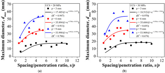 As shown in Figure 10, the relationship between dmax and the s/p was similar to that between CI and the s/p. At the same s/p, dmax increased as the penetration depth increased. dmax increased with an increase in s/p, and at a specific s/p, dmax reached a maximum. Subsequently, even if s/p increased, dmax did not change significantly. The regression curve of p = 3 mm in Figure 10b, which shows a high correlation (R2 = 0.970), demonstrates that dmax reached its maximum value at an s/p of approximately 4, and even at larger s/p values, dmax was approximately 16 mm.