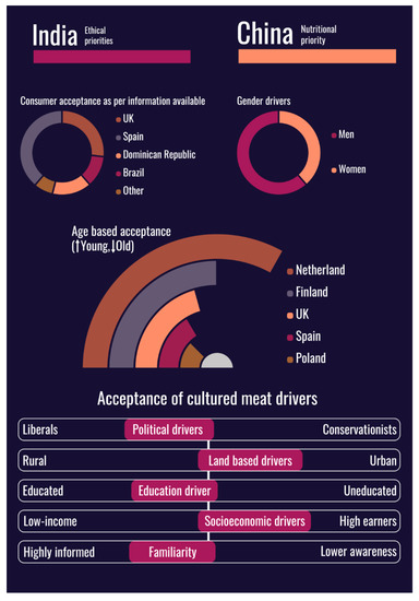 Attitudinal drivers play a significant role in different countries. Comparison between surveys conducted in both India and China indicated significantly higher consumer acceptance of CUME compared to the USA (Figure 1). Ethical priorities have been a major driving factor in India. In China [12], the most important factor was a healthy diet. Disgust relating to CUME turned out to be the most significant factor for US consumers. Therefore, knowing these drivers could prove useful in efforts to design marketing content strategies to address consumer responses in different countries [13]. Another study compared attitudes among 4 countries. They recorded the highest acceptance rate in Spain (42%), followed by the UK (20%), the Dominican Republic (15%), and finally, Brazil (11.5%). Research data showed that older consumers (65+ age group) exhibited higher acceptance of CUME, as per surveys conducted in 5 European countries. In a study of five countries, the highest acceptance was observed in The Netherlands, followed by Finland, the UK, Spain, and Poland. A more traditional mindset in people was associated with a lower willingness to adopt new ideas [12,14].