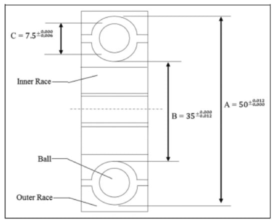 The range of clearance is being kept as 18–24 microns. The tolerance of dimensions of P1, P2, and P3 are directly taken from Lu and Fei (2015) []. The dimensional specifications of the ball bearing assembly considered in this work are shown in Figure 2.