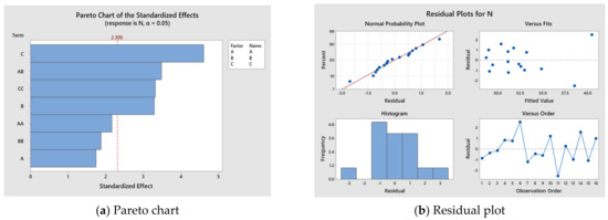 Furthermore, the quadratic type multiple linear regression model (MLRM) for the number of assemblies is formulated using Minitab™ software based on the relation between the number of bins of parts A, B, and C and the output response as success rate. The MLRM is given in Equation (9).