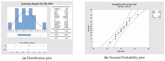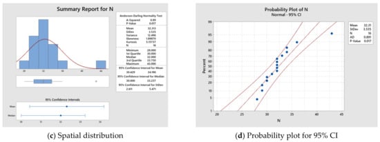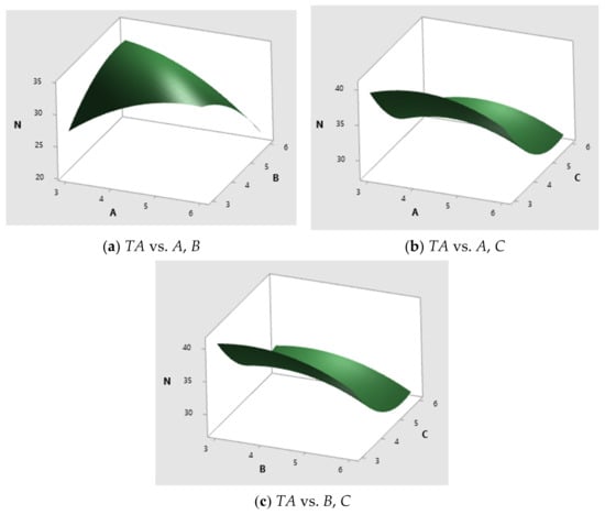 The significance of the number of bins of each part to maximize the number of assemblies is thoroughly analyzed using the following statistical analyses. The Pareto chart and residual plot are given in Figure 4a,b, respectively. The influence of the number of bins of different parts on making the number of successful assemblies is clearly understood from these figures. From the spatial distribution (Figure 4c), it is concluded that the range of the number of bins for each part is appropriately selected. The probability plot is given in Figure 4d. It is used to verify the statistical significance of the number of bins of parts A, B, and C in increasing the success rate of making assemblies. The surface plots indicating the relationship between the number of total assemblies (TA) and the number of bins of parts A, B, and C are given in Figure 5. It is understood from Figure 5a that the TA value is gradually increased when increasing the number of bins of part A. However, when increasing the number of bins of part B, the TA value is gradually decreased. Figure 5b depicts that the TA value is slightly increased initially and then decreased while increasing the number of bins of part A. However, when increasing the number of bins of part B, the TA value is gradually decreased and then increased. The same kind of pattern is also observed in Figure 5c as in Figure 5b. Furthermore, the statistical analyses on the results of the HS algorithm are presented in Figure 6.