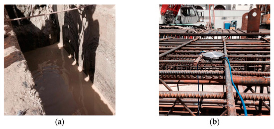 Construction site pictures. (a) Notch of the underground diaphragm wall; (b) lateral pressure gauge on the reinforcement cage; (c) hoisting the reinforcement cage; (d) pouring concrete.