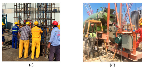 The submerged concrete used in the present study has a compressive strength of 40 MPa after 28 days. The percentage of longitudinal reinforcement in this underground diaphragm wall is 0.7%. The casting of this underground diaphragm wall lasted 16 h, with 375 m3 of concrete casted from the bottom up in 21 concrete mixer trucks, each containing 18 m3 of concrete, with an average casting speed of 16.846 m/h. The peak casting speed of one truck reached 32.148 m/h if the casting was easy.