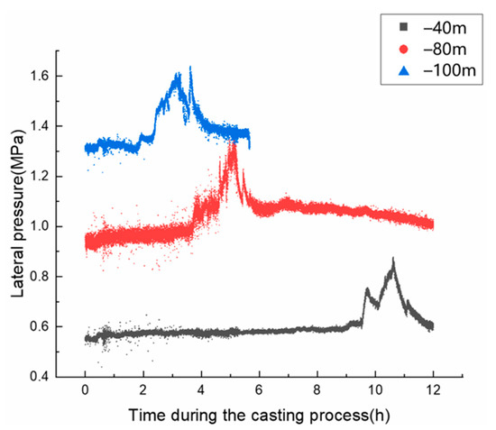 At the heights of −100 m, −80 m and −40 m, the initial mud pressure in the lateral direction before casting was 1.3 MPa, 1 MPa and 0.52 MPa, respectively, which was about 1.3 times higher than the hydrostatic pressure. According to monitoring data, the lateral pressure gradually increased and then decreased as concrete casting progressed. The peak pressures at the three measurement points were 1.6 MPa, 1.4 MPa and 0.9 MPa. In general, the results show that the lateral pressure increased by 30% to 50% relative to the initial slurry pressure during the casting process. When the concrete was finally set, the final value of the lateral pressure was almost the same as the initial value.