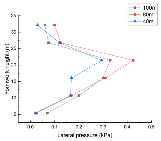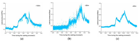 Figure 3 shows the development of the lateral pressure at the three measured points from the beginning of the cast. The lateral pressure meter at the −100 m measurement point was damaged six hours after casting. The monitoring meter data was lost after twelve hours of casting, and the monitoring ended. For each measurement point, time points four hours before and after the peak were selected for further analysis; the data are detailed in Figure 4 and Table 3.