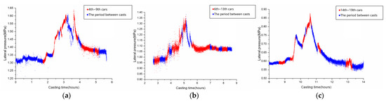 Effect of the number of casts on lateral pressure at depths of 100 m, 80 m and 40 m. (a) The depth of the measurement point is 100 m; the red dots indicate the casting period (fourth to ninth cars), and the blue dots indicate the period between casts. (b) The depth of the measurement point is 80 m; the red dots indicate the casting period (6th to 13th cars), and the blue dots indicate the period between casts. (c) The depth of the measurement point is 40 m; the red dots indicate the casting period (14th to 19th cars), and the blue dots indicate the period between casts.