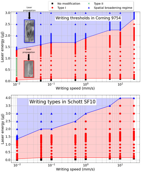 Determination of the optical modifications landscape in the energy–speed domain: During laser direct writing, the non-linear absorption of laser energy by the material locally modifies its physical properties. Different types of permanent modifications can then appear according to the defined parameters. Three main types of modifications are defined in the literature [1,10,17]. Type I is defined as the appearance of a smooth, homogeneous, and permanent variation in the refractive index. The threshold for the appearance of the Type I change is at low energy. This type of modification allows 3D engineering of the index profiles with fine control of the refractive index variation. It is therefore a type of modification particularly interesting for the manufacture of optical components, especially in the field of imaging or for optical waveguides and gratings. Type II corresponds to an anisotropic modification of the refractive index whose orientation can be controlled by the writing laser polarization. In most oxide glasses, and according to specific conditions of pulse duration, repetition rate, pulse number and pulse energy, and self-assembled periodic nanostructures can appear and make the glass locally birefringent. With higher laser intensities, voids resulting from micro-explosions can appear in the material: this is the Type III modification. We can finally define the last type of modification appearing at high laser intensities. Often abusively called “heat accumulation regime” in the literature, this modification corresponds to a smooth and homogeneous variation of the refractive index with a significant increase in the size of the modified area compared to the size of the energy source. This spatially broadened Type I modification will therefore be referred to as the “spatial broadening regime” that described this phenomenon more accurately [18].