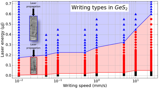 Figure 1 shows the different types obtained as a function of the scanning speed and the laser pulse energy in 9754 and GeS2 glasses. SF10 has writing-type threshold graphs similar to those of 9754 in Figure 1. In particular, the energy thresholds needed for the appearance of Type I or spatial broadening regimes are similar: about 0.1 µJ for Type I and between 1.5 µJ and 2 µJ for the “spatial broadening regime”. It should be noted, however, that 9754 is the only one, which shows the appearance of Type II, and none of the three materials showed Type III—voids formation. For a low writing speed (typ. 0.01 mm/s) self-assembled periodic nanostructures appear in 9754 glass, creating a birefringence whose neutral axes are oriented by the femtosecond laser polarization [19]. In contrast, we note that the chalcogenide glass has low Type I thresholds of a few nJ at low scanning speeds and a few 10 s nJ at high scanning speeds (>1, up to ). The spatial broadening regime also appears for low energies of a few . On the contrary, SF10 and 9754 oxide glasses show thresholds of about one order higher for both Type I threshold and spatial broadening regime. Taking into account the size of the laser beam, we can express the Type I thresholds in terms of fluence (J/cm²). In our typical writing conditions, at the scanning speed of 1 mm/s, we calculate the corresponding fluence per pulse in GeS2 at 2.7 J/cm², in 9754 at 11.1 J/cm², and in SF10 at 13.3 J/cm².