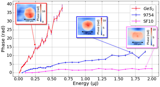 Phase variation implemented by the FLDW technique as a function of laser energy. The writing speed of these irradiations is fixed at 1 mm/s (corresponding to about 120 pulses/μm). Inset: an example of a quantitative phase map measured by the Quantitative Phase Microscopy technique has been added for each material. Laser parameters: 1030 nm, 800 fs, 100 kHz, and 0.6 NA.
