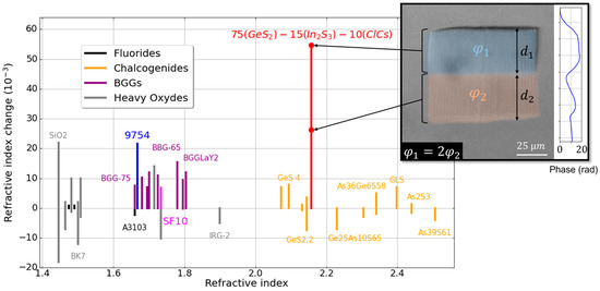 Range of refractive index variation induced by fs-laser vs. refractive index (typ. Measured at 550 nm) for different glasses. Our materials: GeS2 in red, Corning 9754 in blue, and Schott SF10 in pink. Inset: a false color image of a textured disc profile showing the two sections of the phase and the associated phase profile along the cross-section.