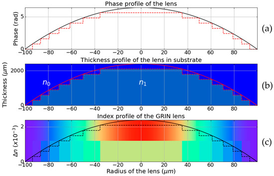 (a) GRIN lens phase profile. In black, the continuous phase profile, and in red, the discrete phase profile. (b) Thickness profile of a gradient thickness lens and its discretization corresponding to the phase profile presented in (a). (c) Refractive index profile of a gradient index lens and its discretization corresponding to the phase profile presented in (a). The color variation represents the radial refractive index variation.