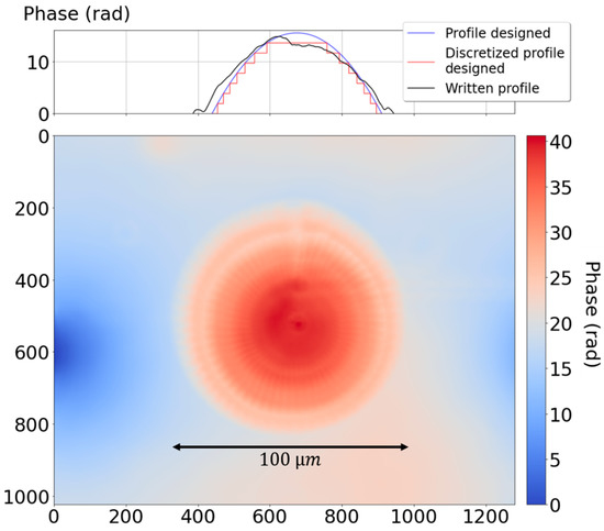 Quantitative phase map of a gradient index lens written in GeS2 glass sample at scanning speed. Top: plot of the designed profile and the imprinted profile after background subtraction. Laser parameters: 1030 nm, 800 fs, 100 kHz, 0.6 NA.