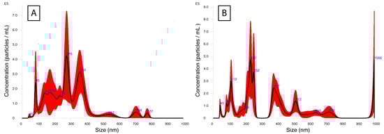 Hydrodynamic size measurements with NTA. The graph shows particle size distribution in the range of 0–1000 nm for (A) bare TiO2 and (B) TiO2–Fe3O4.
