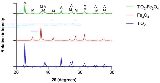 X-ray powder diffraction patterns of bare TiO2, Fe3O4 and TiO2–Fe3O4 composite materials. A—reflection corresponding to anatase TiO2, M—reflection corresponding to magnetite Fe3O4.