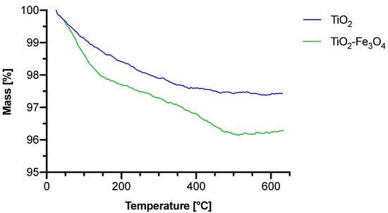 For bare TiO2, one stage in the range of 26–384 °C with 2.51% mass loss was noted, and the mass loss can be associated with the evaporation of surface water. For the composite material, the thermal decomposition of TiO2–Fe3O4 reveals two stages. The first stage begins at 26 °C and ends at 187 °C with a mass loss of 2.24%, whereas the second stage appears in the range of 188–635 °C with a resulting mass loss of 1.45%. The first stage can be associated with the evaporation of water residue from the surface of TiO2. The mass changes in the second stage result from the condensation of surface hydroxyl groups within TiO2 [20], similarly to bare TiO2, but in the composite material, this process is split between the two stages. Based on literature data, Fe3O4 is known to not undergo any decomposition and only lose moisture [21]. While exposed to air, any mass changes coming from the oxidation process of Fe3O4 into Fe2O3 overlap with the changes associated with the evaporation of surface water.