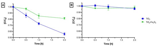 After 2 h of irradiation with green light in the presence of bare TiO2 only a mean 4% ibuprofen degradation rate was achieved (Figure 5B). The obtained result could be considered statistically insignificant and treated as a lack of activity. Interestingly, the composite showed only comparable photoactivity in green light as bare TiO2. The result is contradictory to the expected effect as the Fe3O4 band gap should allow the absorption of wavelengths from the green light region [22] and subsequent sensitization of TiO2. Initially, TiO2–Fe3O4 showed much better degradation rates of ibuprofen than bare TiO2. However, after 1 h time, the ibuprofen concentration slightly increased, indicating that the photocatalytic reaction stopped and that ibuprofen desorbed from the photocatalyst’s surface back to the reaction suspension. After 2 h of irradiation, only a 3% IBU degradation rate was noted with TiO2–Fe3O4. The disappearance of TiO2–Fe3O4 photoactivity in both irradiation tests was accompanied by the browning of the TiO2–Fe3O4 material during irradiation which is associated with the oxidation of Fe3O4 within the photosensitizer to maghemite (γ-Fe2O3).