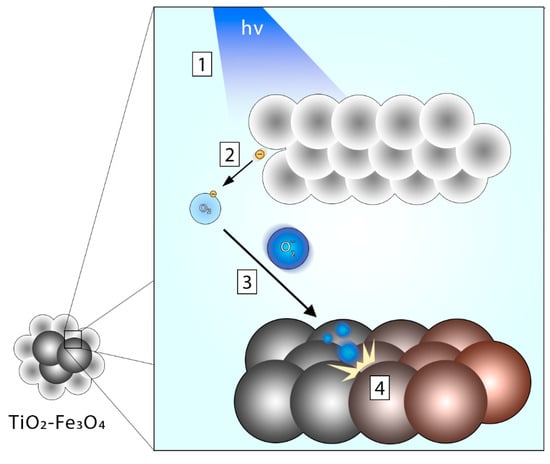 The process can be explained as follows: after irradiation of TiO2 with light (1), photons that have higher energy than the TiO2 bandgap are absorbed, and the energy is consumed for the transition of TiO2 unpaired electrons from the valence band to the conduction band. The conduction band electrons interact with surface oxygen leading to the creation of superoxide radicals (2), which then react with Fe3O4 within the composite system leading to the transformation of magnetite to maghemite (3) [3,24].