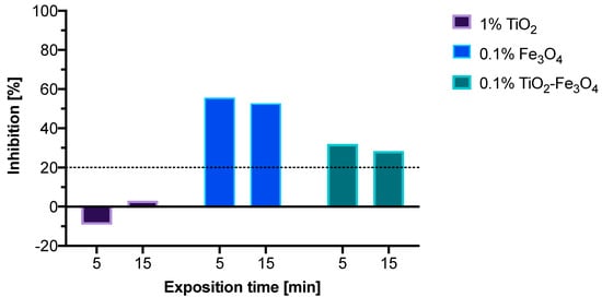 The acute toxicity of the material was investigated through a Microtox protocol, and the results are presented in Figure 7. Materials that showed inhibition rates under 20% were treated as non-toxic [32]. Bare TiO2 reveals negligible toxicity to A. fischerii, even at 1% concentration, 10 times higher than the concentration of the photocatalysts used in the photocatalytic tests. Interestingly, a slight hormetic effect can also be noted for TiO2, which then decreases with a prolonged time of exposure. It is interesting that the toxic effect of Fe3O4 was reduced after grafting it on TiO2. These results are in line with those previously reported in the literature, including the ability of TiO2 to reduce the acute toxicity of other metal particles [16].