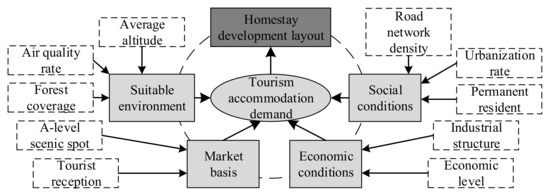 As a form of tourism and accommodation, the impacts of many factors, such as economy, society, culture and ecology, on the layout of homestays in different research regions is different [41], and the influencing factors and intensity of homestay spatial distributions in different regions are also different (Table 1). According to the characteristics and conditions of the study area, this paper selected the indicators that were highly representative, easy to obtain, quantifiable, and practical for the analysis and research (Figure 2).