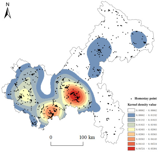 Kernel density estimation mainly estimates the probability density value according to the distance between the elements to be estimated and the sample elements, and studies the spatial distribution characteristics by using the spatial attributes of the data samples [39,40], which can better show the concentration degree of the spatial distribution of the guest house. The formula is: