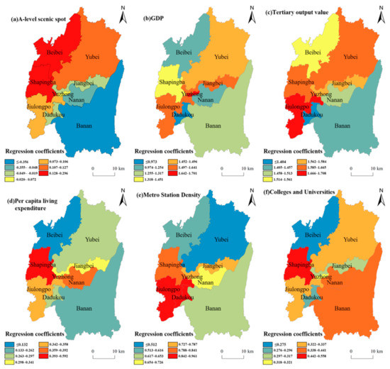From the influencing factors of the spatial distribution of homestays in the central urban area, at the level of tourism resource endowment, the influence of the number of class A scenic spots on the homestay layout gradually weakened from the Northwest to the Southeast directions within the central urban area, among which Beibei District and Shapingba District had the strongest influence, followed by Yuzhong District, Yubei District, and Jiulongpo District. From the perspective of the economic development level, the GDP level had an obvious positive impact on the distribution of homestays in the central urban area, and the influence gradually weakened from the center to the surrounding areas. In particular, the distribution of homestays in Yuzhong District, Jiangbei District, Yubei District, and Jiulongpo District was strongly affected by GDP. From the perspective of the development level of the service industry, the positive impact of the output value of the tertiary industry on the distribution of homestays was the strongest in Jiulongpo District, Shapingba District, and Yubei District, and then gradually weakened towards the Northwest and Southeast. From the perspective of the consumption demand level, the per capita living consumption expenditure index of all residents had a positive impact on the overall spatial distribution of homestays, and the intensity of the effect gradually decreased from Shapingba District, Yuzhong District, and Nan’an District in the middle to the North–South direction. From the perspective of traffic location conditions, the influence intensity of the subway station density index on the distribution of homestays in the central urban area decreased from the middle to the North and South. From the perspective of social development conditions, the impact intensity of the index number of colleges and universities on the distribution of homestays in the central urban area presented scattered spatial characteristics, and the overall impact was positive.