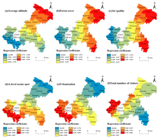 In terms of the influencing factors of the spatial distribution of homestays outside the central urban area, at the level of physical and geographical conditions, the average altitude played a negative role in the spatial distribution of homestays, and the influence of the average altitude on the layout of homestays decreased step by step from the Southwest to Northeast. The quality of the ecological environment is a necessary condition for the development of the tourism industry. The forest-coverage and air-quality rates had a positive impact on the spatial distribution of the homestays; their influence showed the spatial layout gradually decreasing from East to West, forming a banded distribution from East to West. From the perspective of tourism resource endowment, the number of class A scenic spots can have a positive impact on the spatial distribution of homestays outside the central urban area of Chongqing, and its impact degree showed a decreasing trend from the Southwest to Northeast. From the perspective of the urban development level, the urbanization rate had a positive impact on the spatial distribution of homestays in Chongqing, and its impact degree showed a decreasing trend from the Southwest to the Northeast, and presented the characteristics of strip distributions from the Northwest to the Southeast. The influence of the total number of tourists on the spatial distribution of homestays gradually decreased from the Northwest to the Southeast, which was also characterized by a strip distribution.