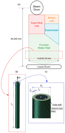 The present work focuses on the water tube boiler. Figure 1 shows a schematic of the different components of the water tube boiler. These are lower water drums where the water is introduced after passing through the economizer and upper steam drum where the steam is extracted and directed to the superheater section. Both drums are connected via water tubes, and the present work concentrates on the furnace section where the water remains in the liquid phase, as shown in Figure 1a. The considered tube has the current dimensions shown in Figure 1b in terms of tube length (), outer pipe diameter (), tube thickness (), and deposit layer thickness (). The water tubes are made from carbon steel seamless pipe (SA210 C) and the deposit layer (Magnetite) is considered in the present work using a generic material with a variable range of thickness. Table 1 shows the material properties of the deposit. The used material properties and driving dimensions for different parts are presented in Table 1. The outer diameter of the tubes and original thicknesses are 44.45 mm and 5.588 mm, respectively. The new thickness of the water tube is set between 1 mm to 6 mm, whereas the thicknesses are based on a deposit maximum length of 0.2 mm. The present work is focused on the water tubes in the furnace section and therefore is considered a single-phase with temperature-independent material properties at the average temperature of inlet water and outlet temperature at the working pressure. Note that the pressure is based on maximum operating pressure at 210 bar, however, which is expected to result in higher stresses on the water tubes.
