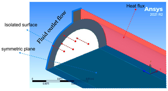 The applied boundary conditions are presented in Figure 2. To reduce the computational costs, the quartile of the domain (i.e., water tube) is considered, and therefore, a symmetry boundary condition is applied on the XZ plane, as indicated in Figure 2. Instead of applying constant heat flux on the outer surface of the water tube from one side and the other side being isolated, the heat transfer at the outer surface of the tube is as follows: